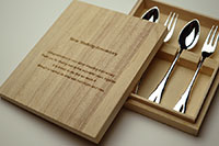 スプーン、フォーク共に表面には名前を、裏面には「祝 銀婚式」などのお祝いの名前や日付を刻印できます。桐箱には贈るお相手様に向けたメッセージを刻印できます。